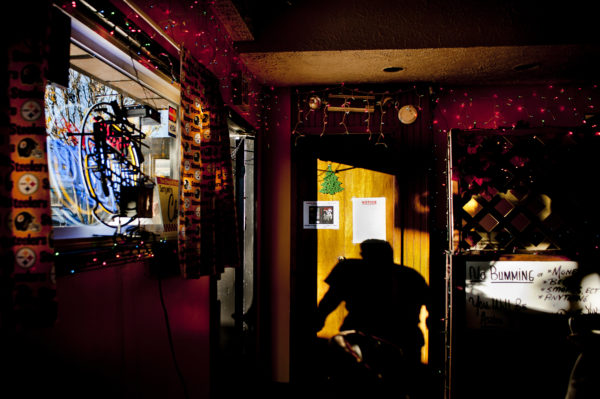 A patron leaves the holiday decorated Nero’s Lounge and Restaurant in Beaver Falls, Pennsylvania.
