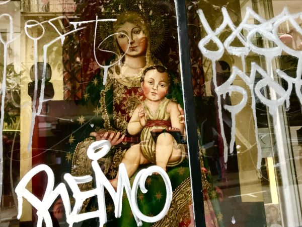 Graffiti adorns the windows of the Paulist Center Bookstore, a Catholic church shop located in San Francisco’s Chinatown.